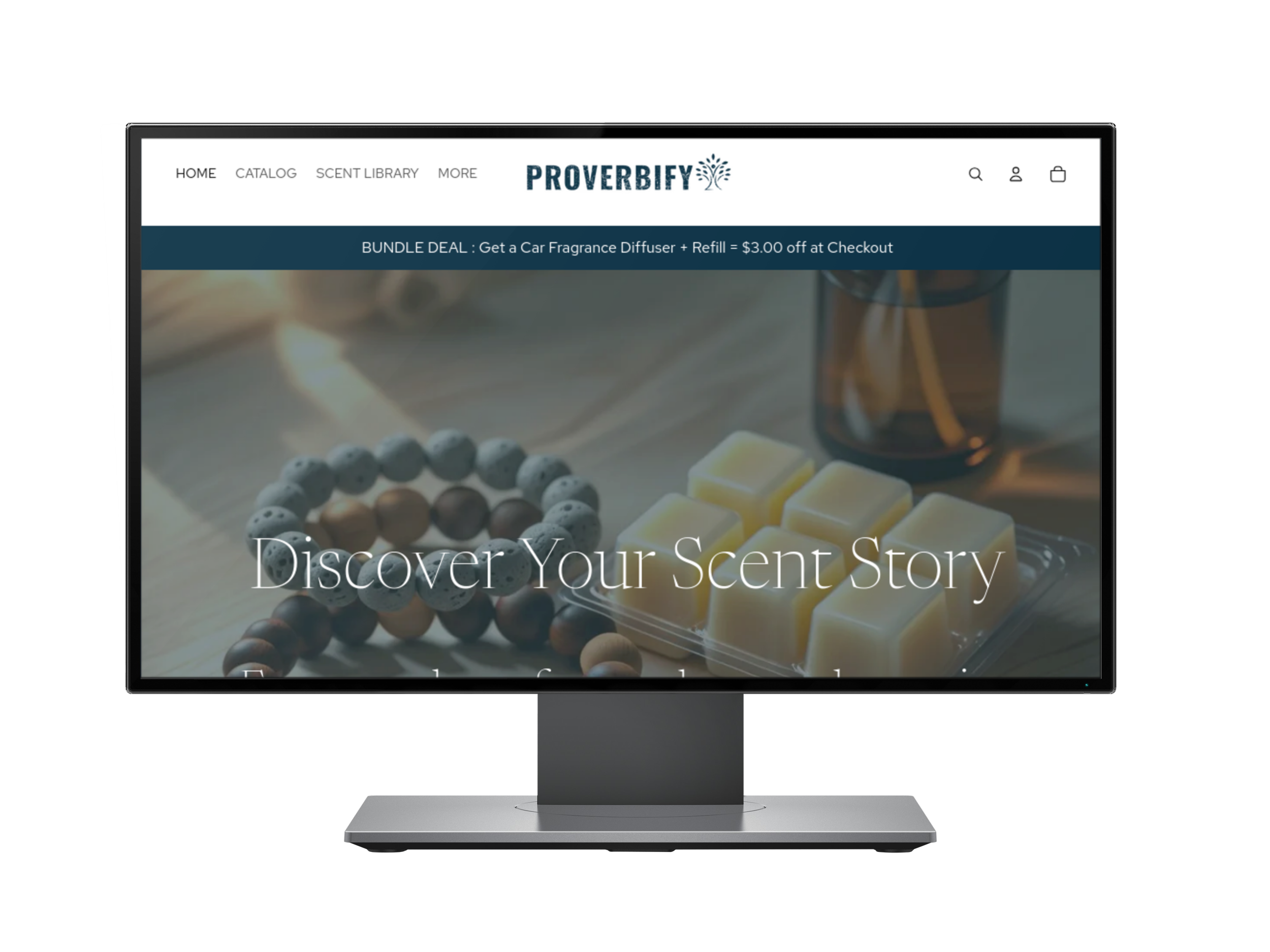 Proverbify Mercantile is a boutique fragrance brand offering culturally inspired scent products—from car vent diffusers to wax melts—packaged with stories and wisdom. The site balances storytelling ("fragrance born from culture and meaning") with e-commerce functionality and visual ambiance.